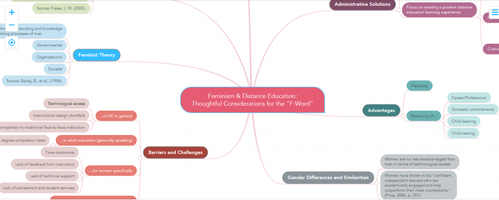 Following my review of the above three feminism subtopics, I then started to rationalize the ways in which they intersected with distance education, and so I came up with the remaining four subtopic areas which would complete the broad formation of my mind-map: Barriers and Challenges; Gender Differences and Similarities; Advantages; and Administrative Solutions (5.10).